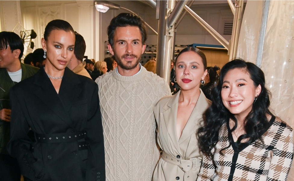 Awkwafina wore a custom gown that draws directly on an archival “Hennes” wedding dress, with a tulip skirt silhouette featuring a high slit in luxurious cream silk-zibeline. Its statement off-the-shoulder neckline is hand-embroidered with a delicate daisy decoration traced in beads and rhinestones. A co-ordinating embroidered pouch bag completes the look.