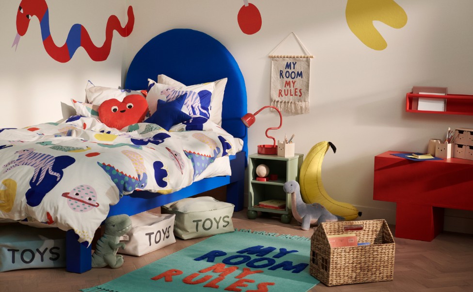 Keeping organisation in mind, H&M HOME presents stackable canvas toy storage boxes. These versatile storage solutions provide ample space for tidying up toys and add a pop of colour and style to any room. For a touch of personal expression, our textile sign and rug with the slogan “My room, my rules” serves as a reminder that a child’s space is a place for them to express their individuality.