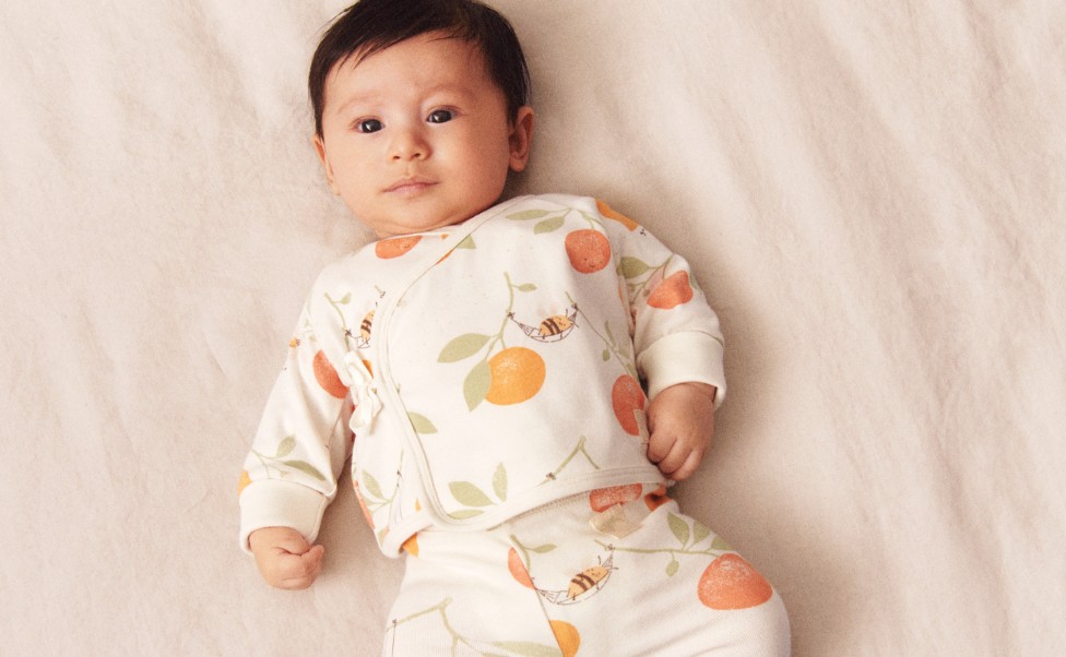 Following the story of a bumblebee and orange flower growing through Spring, there are 15 pieces – tie-wrap long-sleeve tops and bodysuits, ruffle-sleeve top, dungarees, leggings, shorts, hats, blankets and a soft, illustrated baby book. The colour palette includes cream, light peach, light sage green and lilac with pops of tangerine. Soft uneven ribbed, waffle, crinkled and patchwork fabrics and herringbone tape are all made with soft organic cotton, while cute bumblebees, flowers and foliage feature as prints or embroidery.