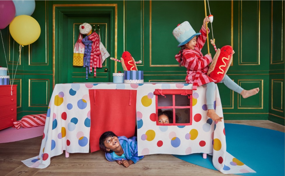 When it’s time for some tomfoolery, the dreamy confetti-print table tent will add the perfect backdrop for some great fun. The caramel and donut cushions as well as the hot dog and ice-cream cone soft toys add the perfect complement to playing kitchen alongside the ice-cream cone apron and chef’s hat set. Throw in a cute cake hat, and the fun is just getting started.
