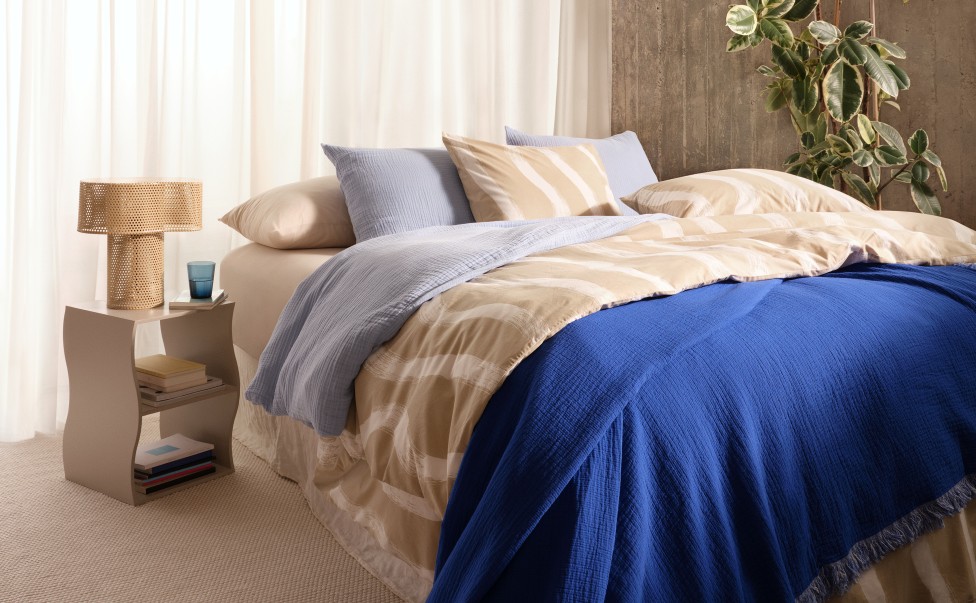When it comes to spring bedding, choose from soft light blue cotton bed sets in single or double, or beige with a white pattern and add a popping Klein blue throw for some colour infusion. If you are craving a real colour pop, this H&M HOME spring collection features block colour or striped bed sets in red, white, yellow, orange, purple and blue. The perfect addition for a colourful spring at home.