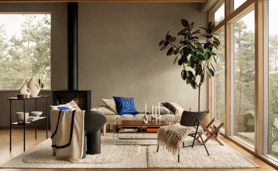 The Fall collection displays an array of artful, sculptural, and bold pieces with a clean and cosy feeling. We see a lot of textures and tactility with inspiration from contemporary craft, and graphic neutrals. Shades of neutral colours dominate, while a splash of klein blue is introduced this season in the form of arty cushion covers made from recycled cotton. Pile cushions in a mix of quality fabrics on to the sofa and drape over a cosy wool blanket for enhanced comfort and warmth. Add softness to the wall with a modern wall hanging and let your feet sink into our fluffy rugs made from jute, wool, and cotton with an abstract but discrete pattern showing in the deep-pile weave. In addition to the decorative cushions and blankets, the furry rug minimises echoes and captures noise in the room.
