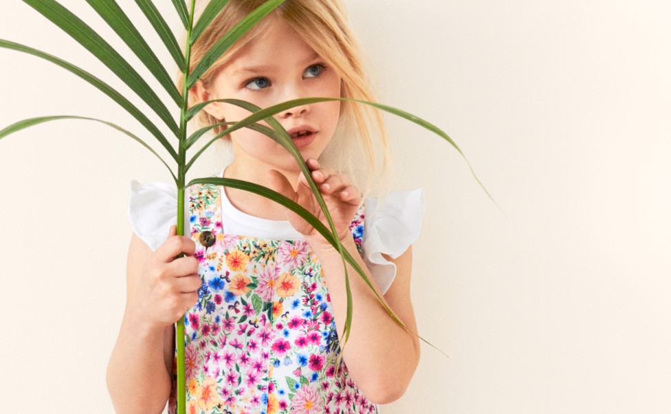Rocha has long played with scale and silhouette; and Rochas’ first ever childrenswear collection includes miniaturised versions of some of her classics, including smocks and frill dresses. There are Aran knit jumpers, cosy cardigans with pearl shaped-buttons, soft joggers and sweatshirts, and a button-through puffer, in pink floral, crafted from recycled polyester. The tartan that runs through the collection reappears on tiny dungarees. The childrenswear collection will be available in sizes 98/104,110/116 and 122/128.