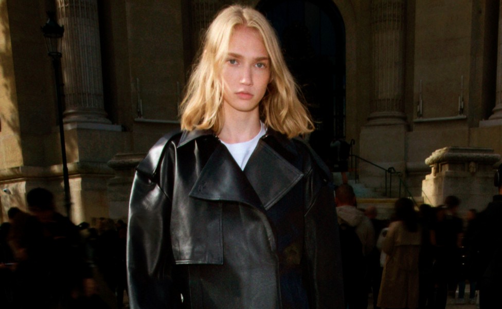 Sharp coats that call to mind a bathrobe, a business shirt and sexy bodysuit in one, and swimsuits that double as a going out top. Throughout the collection, leather, cotton-blend boucle, a knitted Ottoman ribbed fabric and a special boucle-style denim lend structure and texture, while a colour palette of corporate grey, greige, black, white, scarlet red and water blue signal a daring attitude.